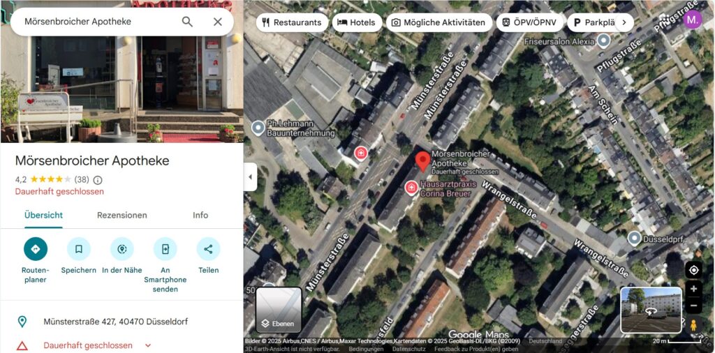 Im Januar 2025 musste die Mörsenbroicher Apotheke schließen (siehe Screenshot, Quelle Google Maps). Dies folgt einem Trend im Stadtviertel Leerstand an der Münsterstraße in Düsseldorf: „Man fühlt sich abgehängt“. Hier traf es zuvor schon die Forum Apotheke, nur weniger hundert Meter entfernt.