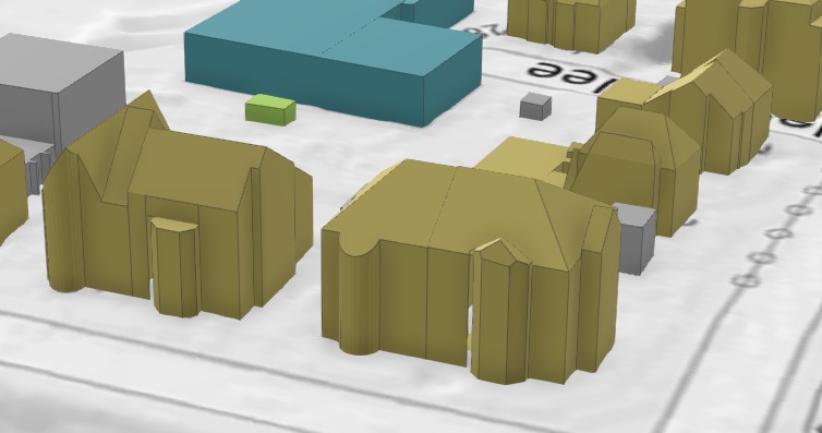 Karl-Schumacher-Str. 2 in Bonn als 3D-Gebäude (LOD2) mit der Nachbaradresse Heussallee 40 als Doppelhaus-Villa. Zur OPEN DATA zählen Adressen, Flurstücke und Siedlungsblöcke. Quelle: https://www.dz.nrw.de/